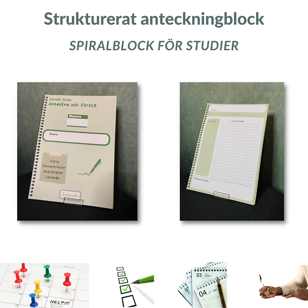 Strukturerat block, framtaget efter den användbara cornell-metoden. Att använda denna typ av anteckningsblock hjälper den som studerar att komma ihåg, skilja ut vad som ör viktigt, repetera och förstå.
